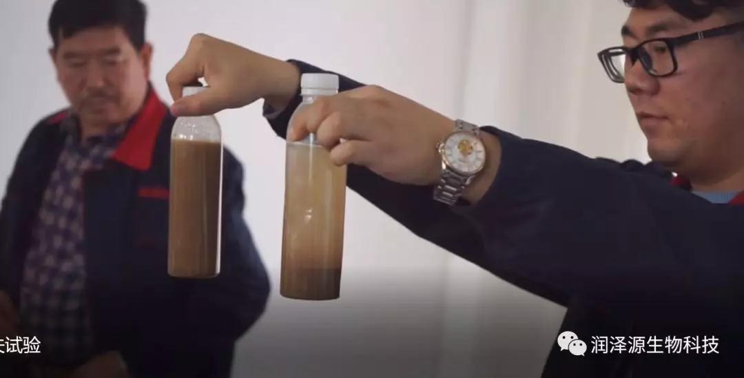 左手为普通尿素,右手是缓控失尿素 缓控失尿素在土壤浑浊液沉淀明显快于普通尿素,倾斜放置,缓控释尿素的沉淀不会结块,而普通尿素则会板结。